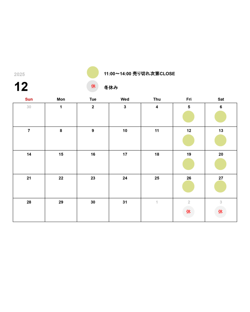 2025年12月の営業スケジュールです!12月も元気に金・土曜日の11:00〜14:00に営業いたします。
